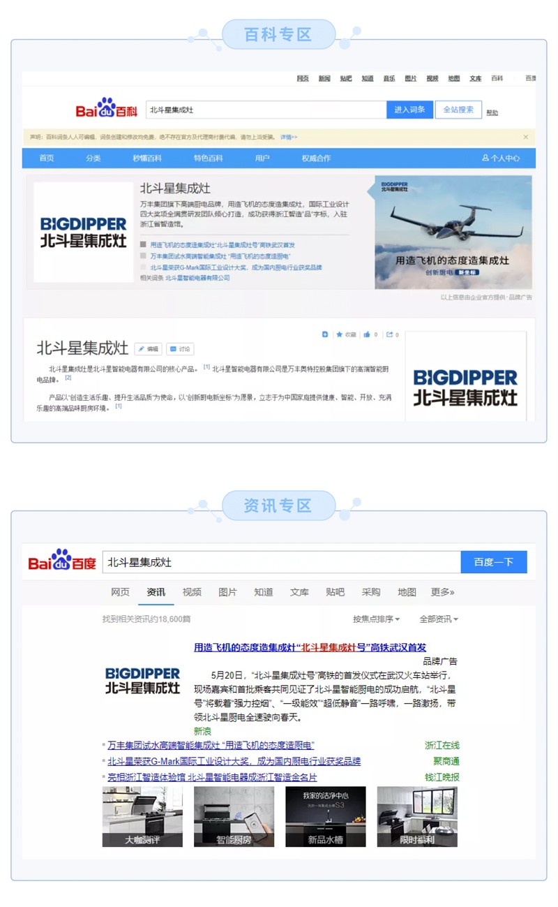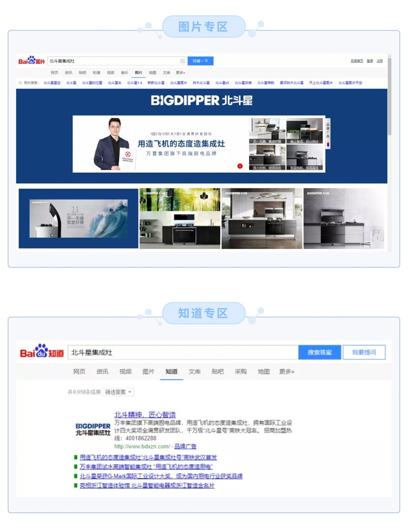 4月,北斗星集成灶攜手百度平臺(tái),通過(guò)平臺(tái)承載的巨大資源以及標(biāo)志性的品牌矩陣入口,與互聯(lián)網(wǎng)進(jìn)行無(wú)縫對(duì)接,上線(xiàn)百度品牌專(zhuān)區(qū),打造品牌搜索矩陣,開(kāi)啟霸屏模式,搶占首頁(yè)黃金位置。